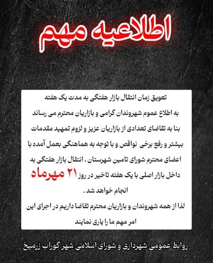 اطلاعیه مهم تعویق زمان انتقال بازار هفتگی به مدت یک هفته
